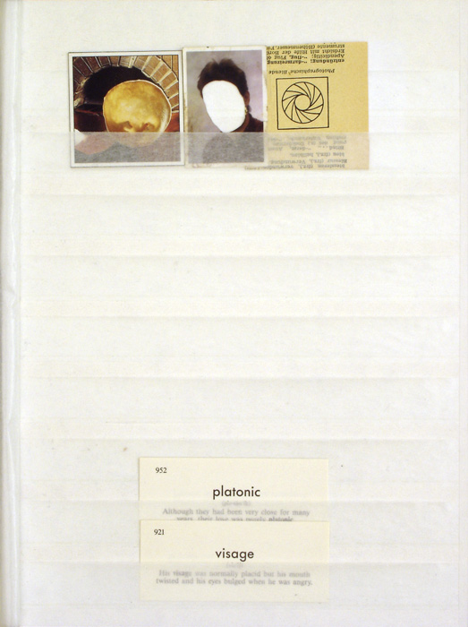 Die Titel zu diesen und auch anderen Werken finde ich mit einem Karteisatz eines Englischen Sprachkurses. Insbesondere die Fremdwörter daraus eignen sich um ein Bedeutungsfeld zu erzeugen, ähnlich wie das auch die Collagen selbst tun.
