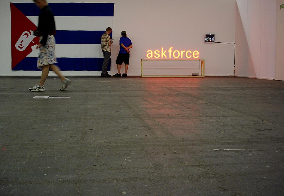 An den Swiss Art Awards hatte ich drei Arbeiten ausgestellt. Die Leuchtschrift “askforce”, die Persiflagge “Tubas” und einige der Simulationen, Wortspiele im virtuellen architektonischen Kontext von Fotomontagen. Tuba hatte ich spontan am Schluss noch mitdazugenommen, da meine Ausstellung in der Schweizer Botschaft in Berlin gecancelled worden war.